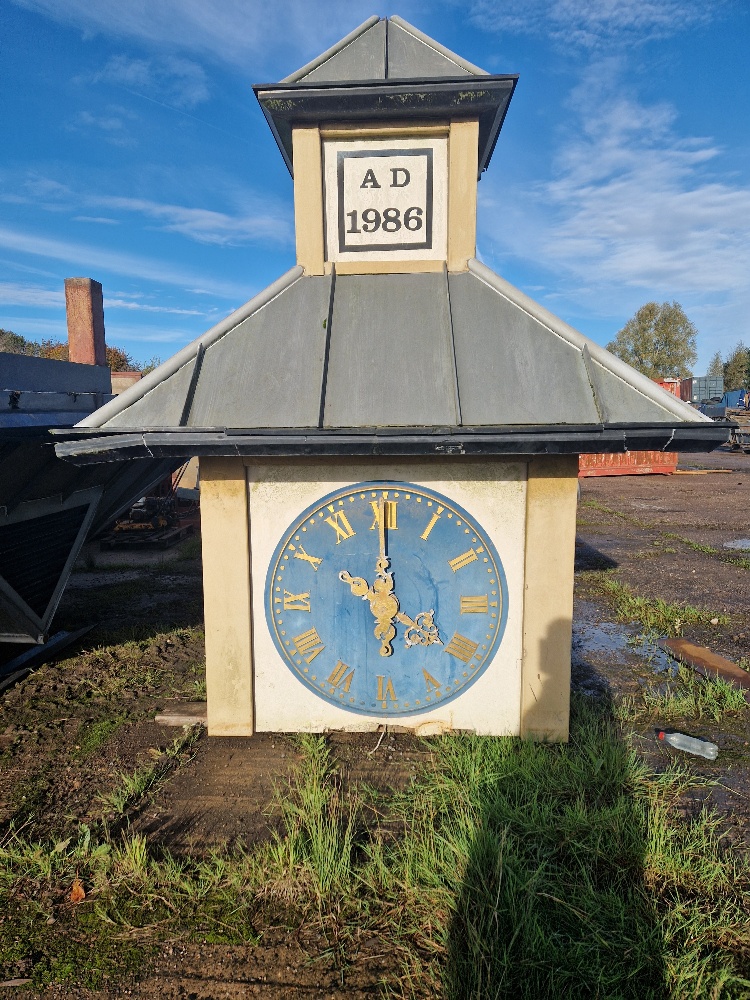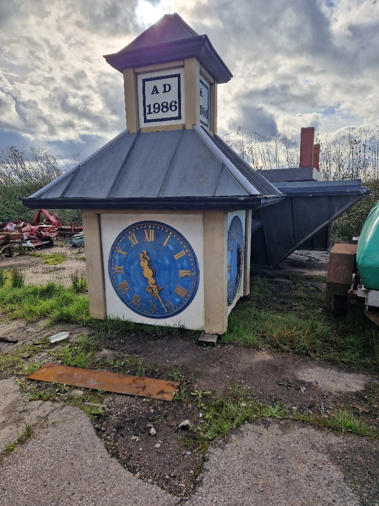 Clock tower with royal blue and gold face comes with supporting base measuring 15ft square, clock base measuring 5.5ft square.